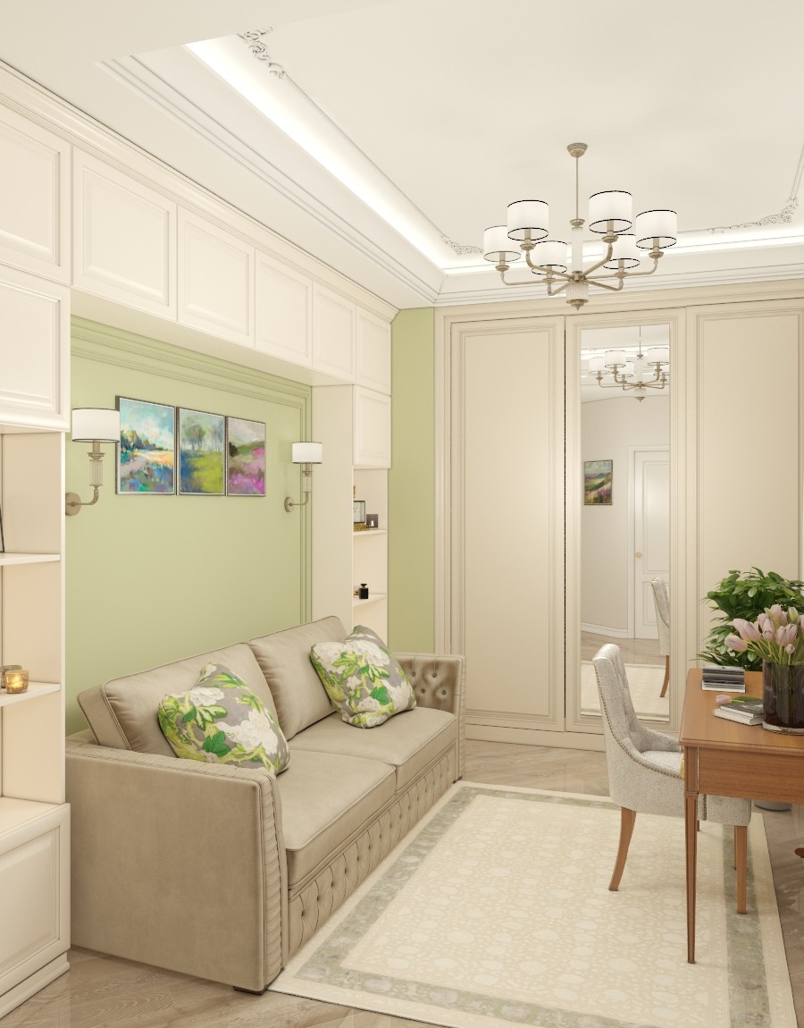Дизайн дома выполнен в современном стиле, с элементами классики и лофта. На первом этаже планировкой предусмотрены общественные помещения: холл, гардеробная, гараж, котельная, постирочная комната, кабинет, гостевой санузел, лестничный холл, просторная гостиная со столовой,