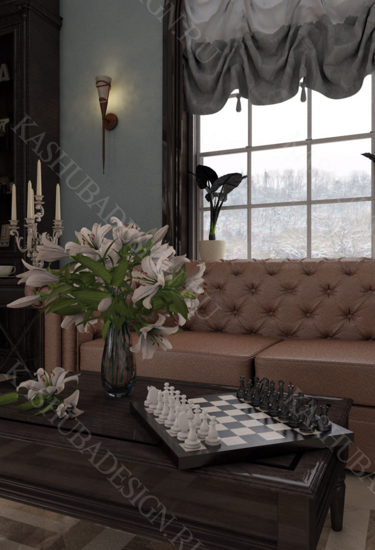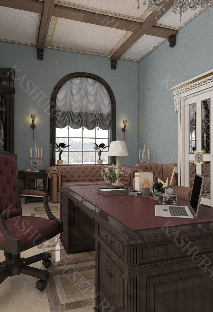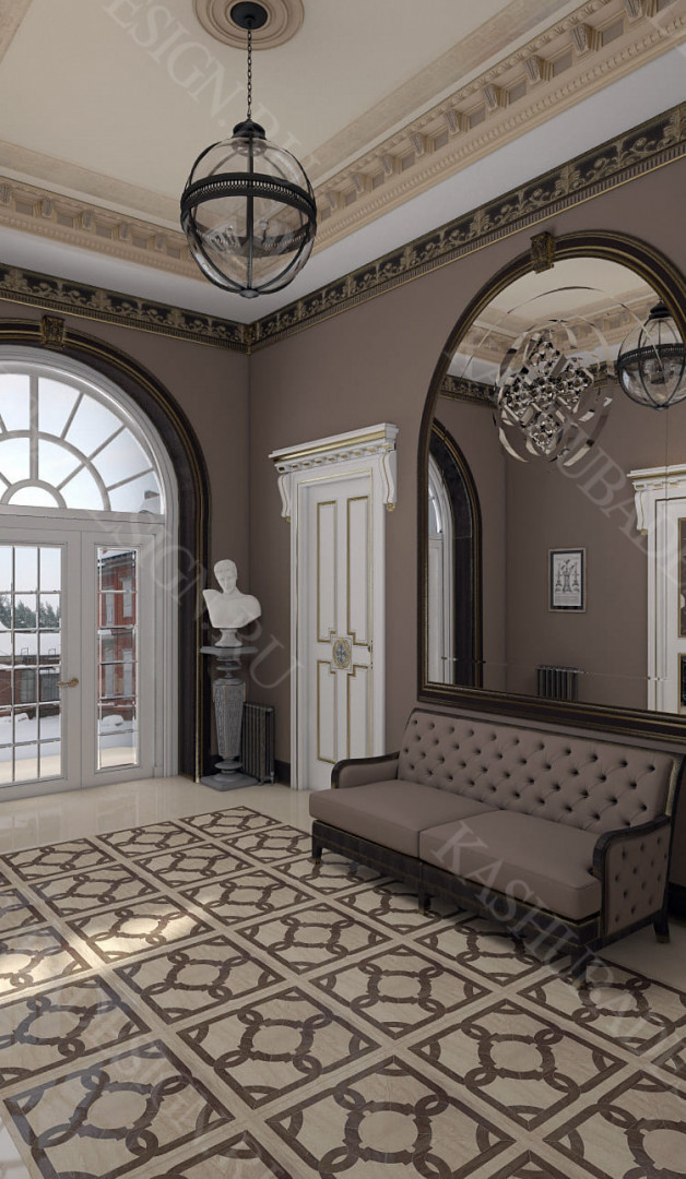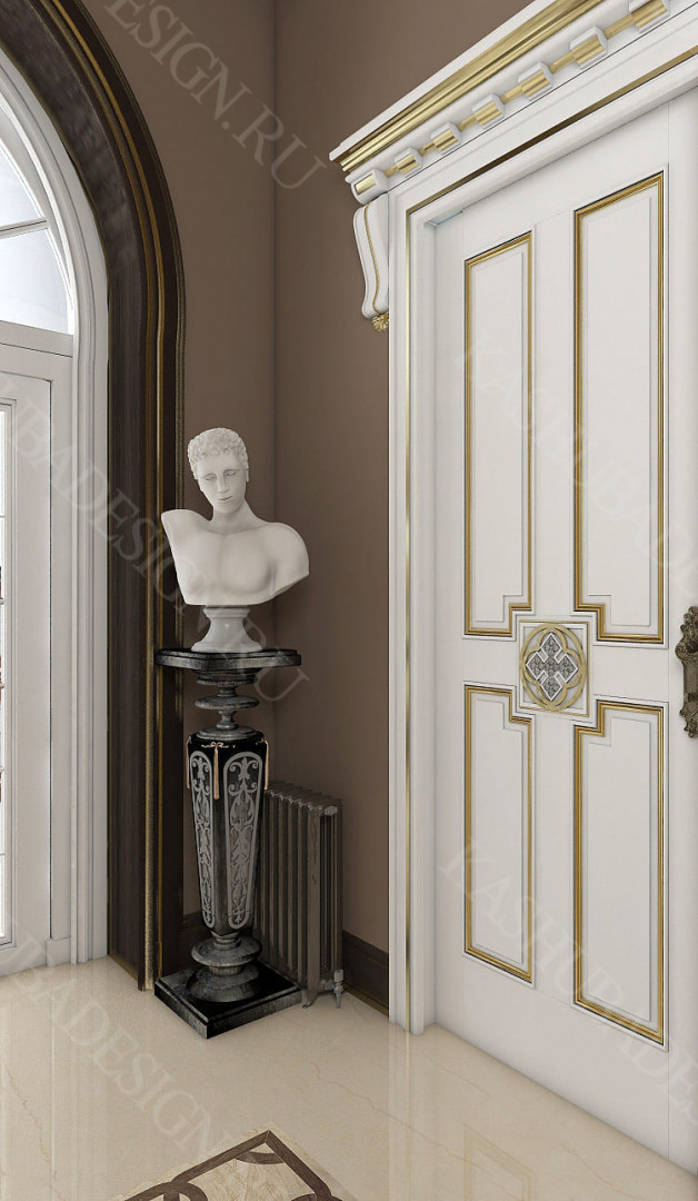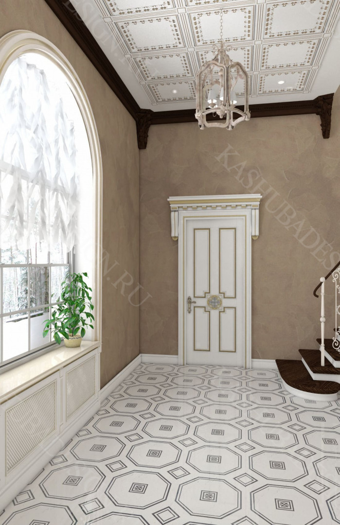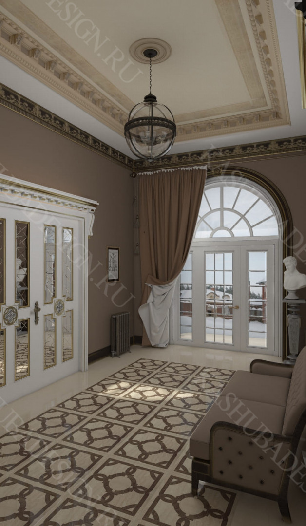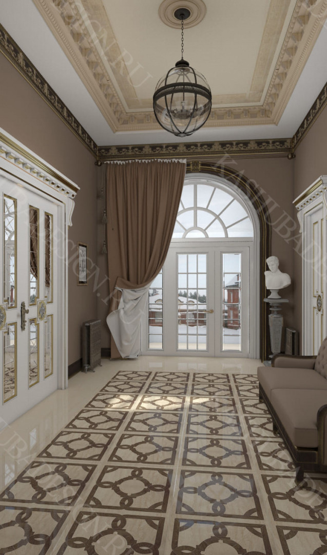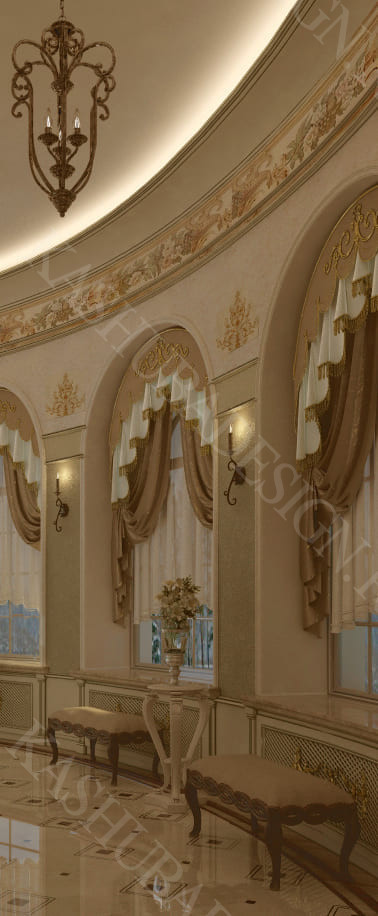 Интерьеры гостевого дома, согласно заданию заказчика, созданы в классическом стиле и духе старой Италии. При входе в дом, обращают на себя внимание - фрески со сценами охоты, размещенные над порталами дверей, и деревянный кессонированный потолок с потёртыми росписями. Главную роль в гостиной на себя берет камин с изразцами. Визуальному зонированию помещений кухни, гостиной и столовой способствует различная отделка стен и мощение плиткой пола. Деревянная лестница на второй этаж располагается в холле, а каменная стена вдоль неё, белый простенок с небольшой дверью и витражной розой, сцены охоты, напоминают об интерьерах средневекового замка.