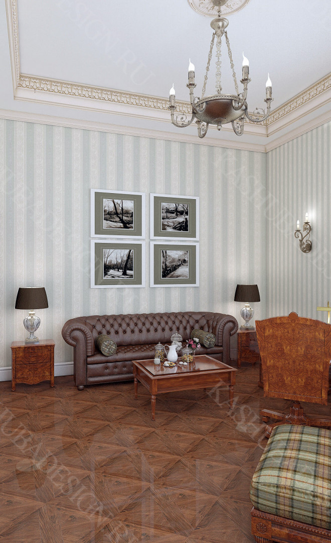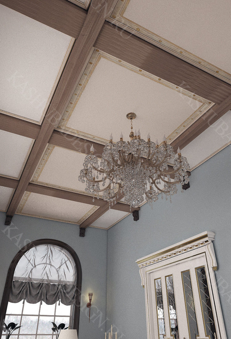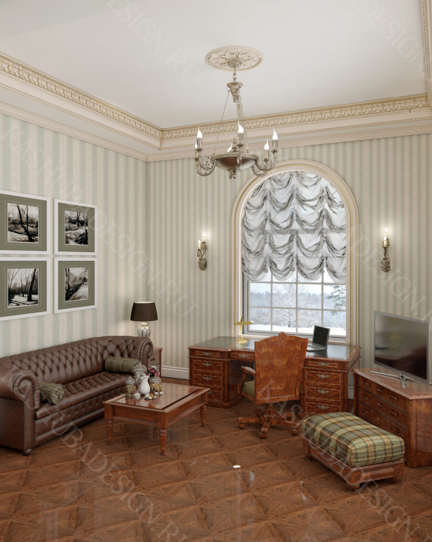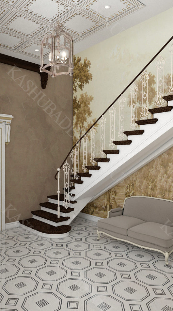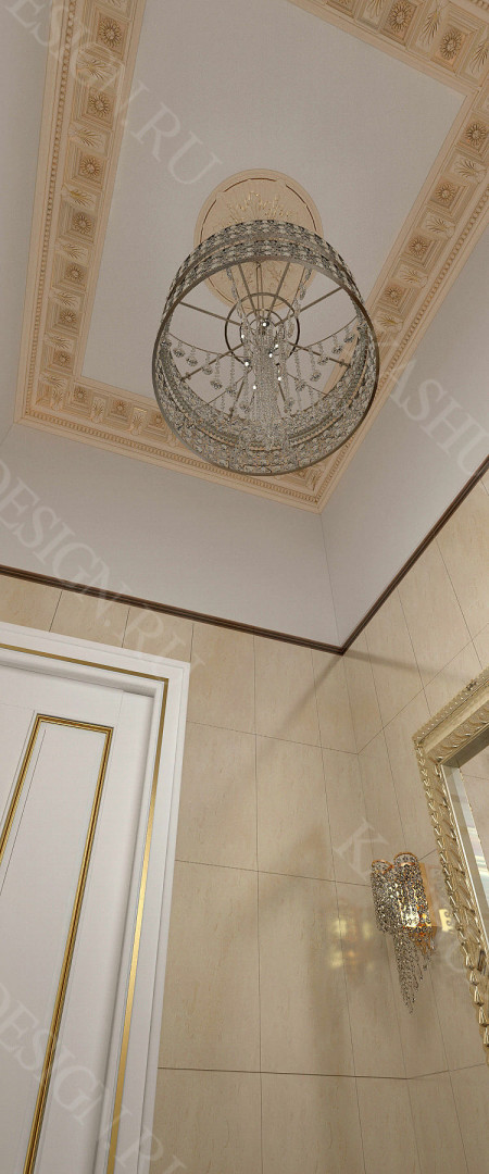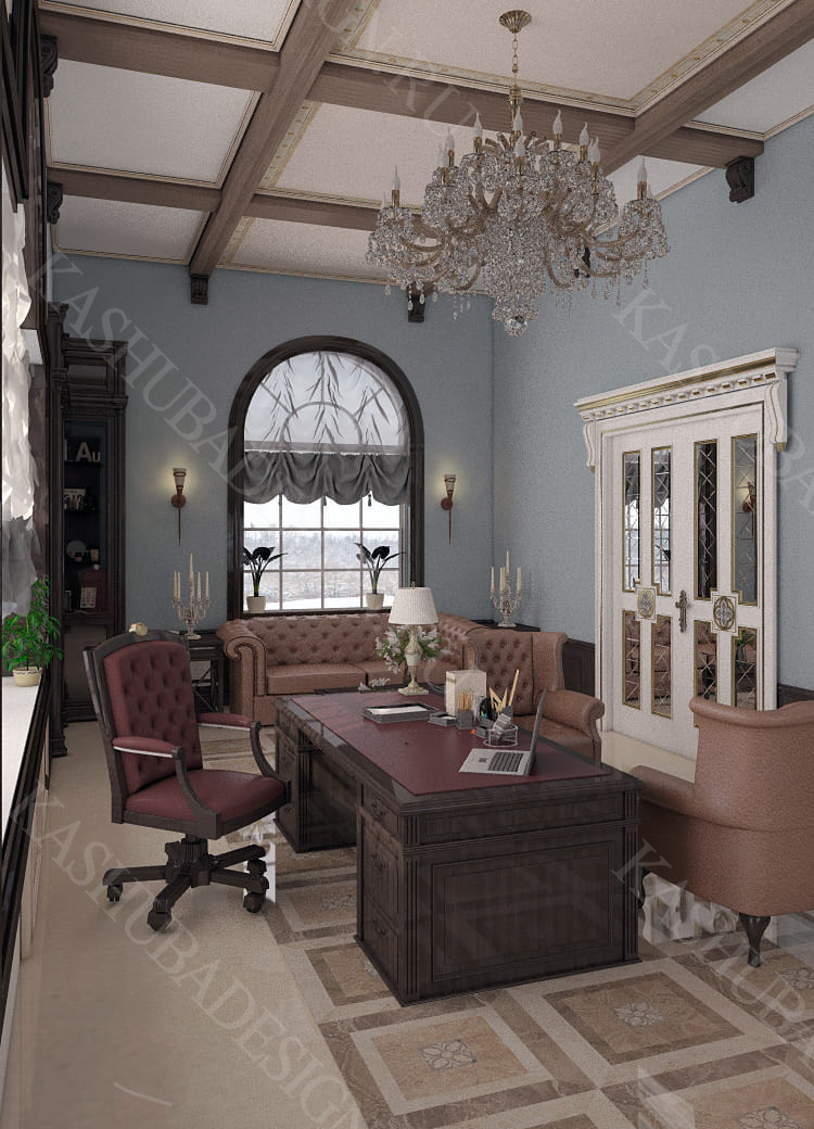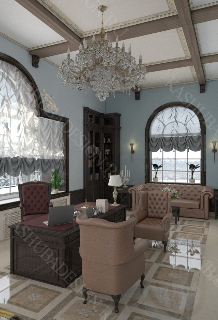 Интерьеры гостевого дома, согласно заданию заказчика, созданы в классическом стиле и духе старой Италии. При входе в дом, обращают на себя внимание - фрески со сценами охоты, размещенные над порталами дверей, и деревянный кессонированный потолок с потёртыми росписями. Главную роль в гостиной на себя берет камин с изразцами. Визуальному зонированию помещений кухни, гостиной и столовой способствует различная отделка стен и мощение плиткой пола. Деревянная лестница на второй этаж располагается в холле, а каменная стена вдоль неё, белый простенок с небольшой дверью и витражной розой, сцены охоты, напоминают об интерьерах средневекового замка.