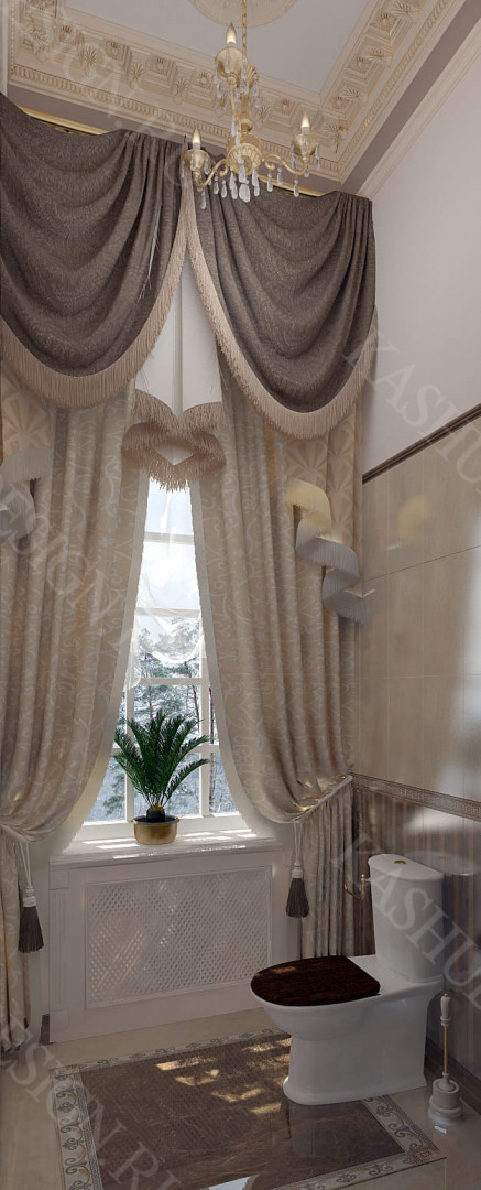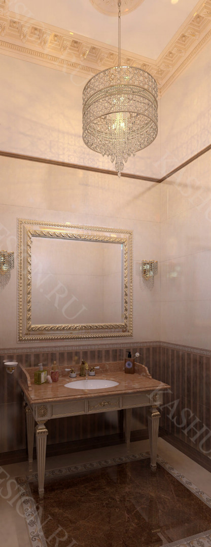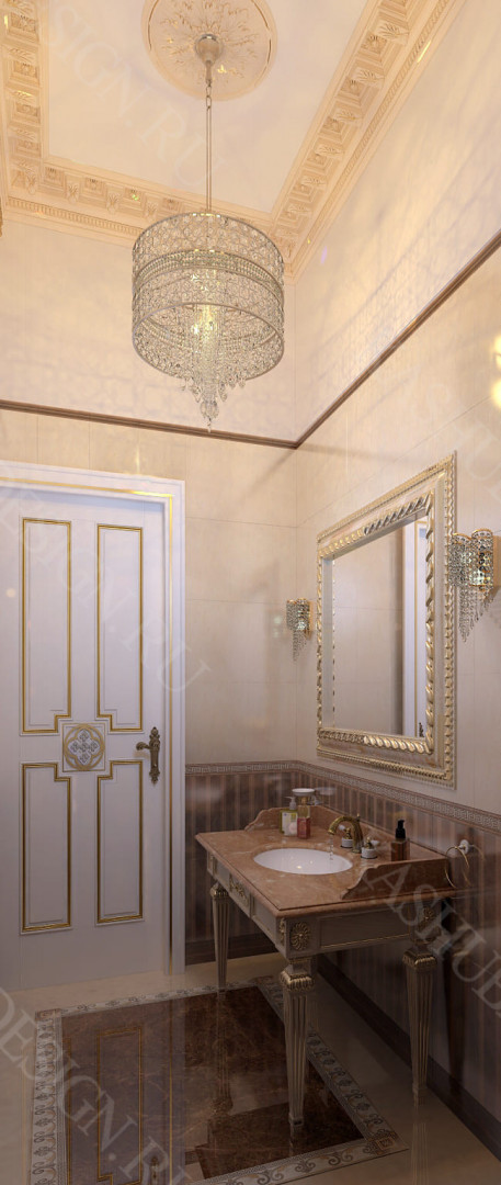 Под лестницей предусмотрен небольшой санузел, потолок которого украшен деревянной резьбой. В спальне используется характерный для итальянских интерьеров прием - деревянный потолок с массивными балками, в центре которого потолочная роспись. Одной из стилеобразующих деталей санузла при спальне являются шаттерсы - деревянные реечные ставни с внутренней стороны окон и теплые тона. Основные экологичные отделочные материалы – дерево, декоративная штукатурка и керамическая плитка. Всё это, включая специально подобранную мебель и светильники, декоративные элементы, создает неповторимую атмосферу доброй Италии, позволяет гостям жить в умело состаренных интерьерах и наслаждаться красотами давнего бытия.