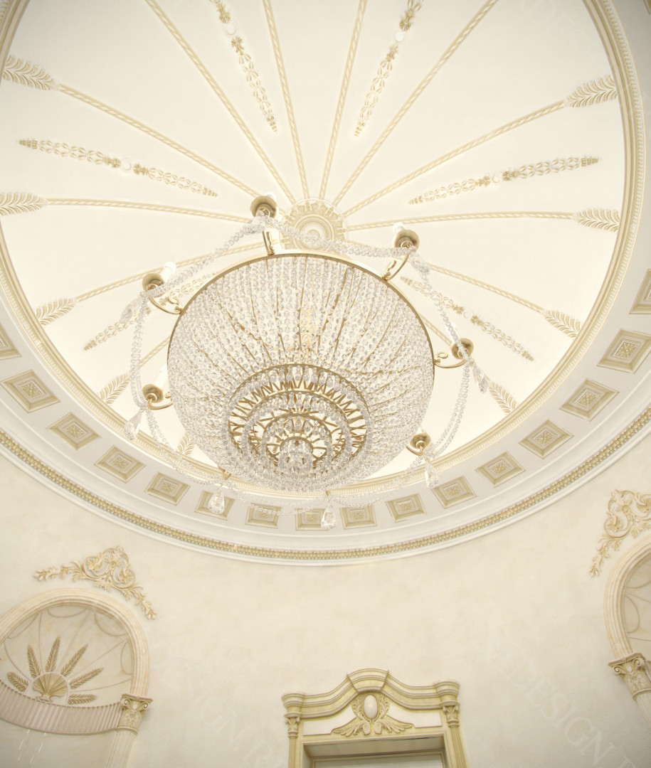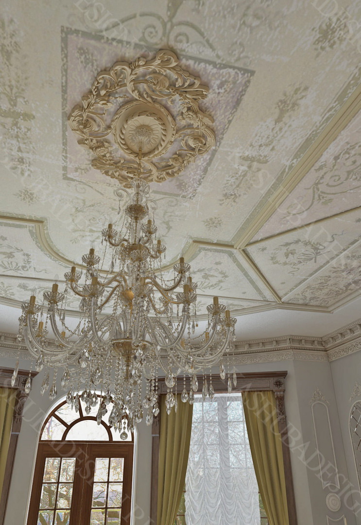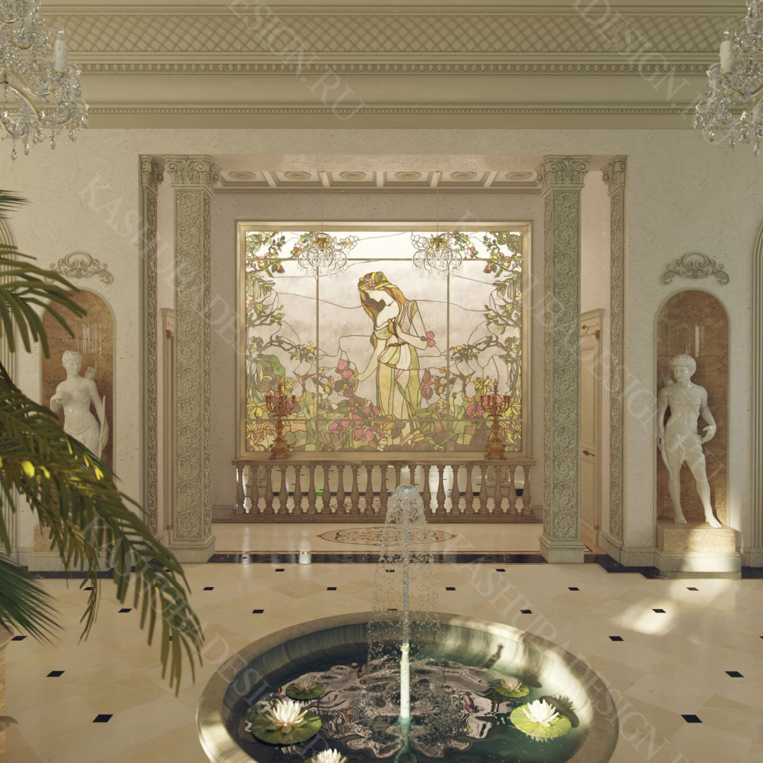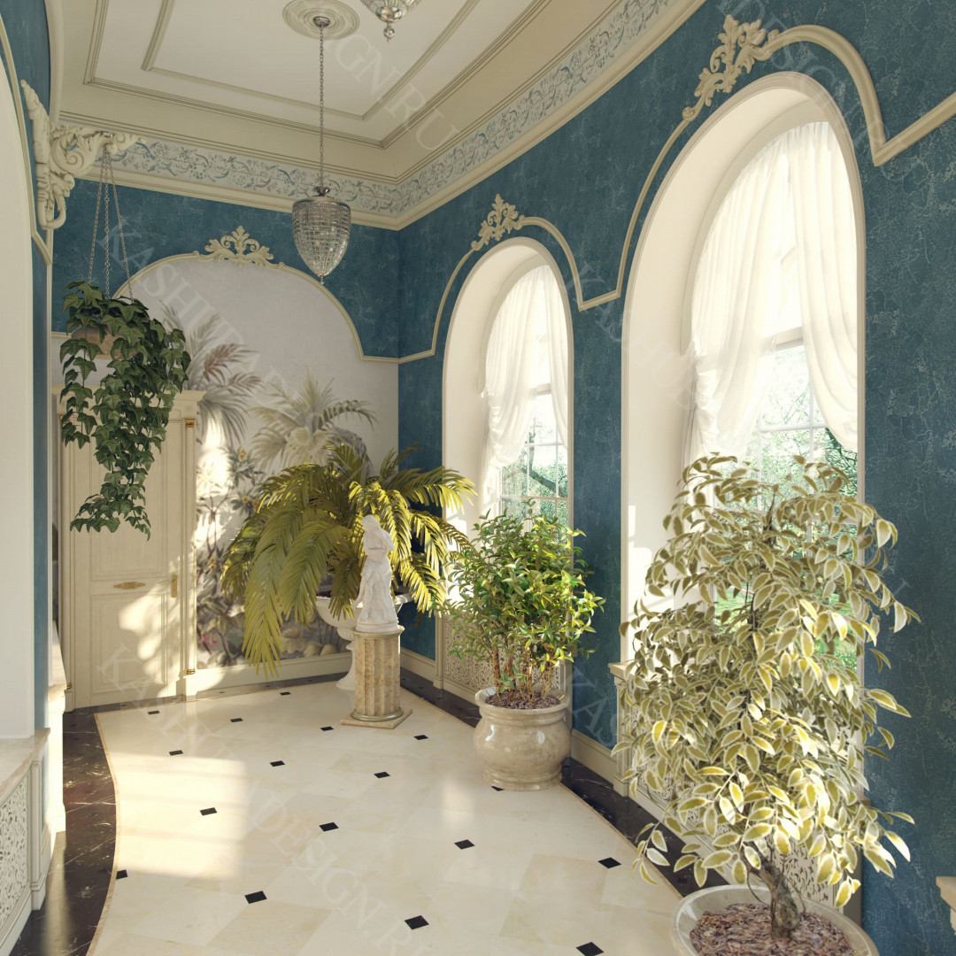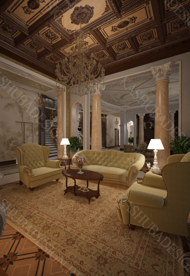 Для всех помещений усадьбы (высота потолков не менее 3-5 метров) характерна красота композиции, дозированное внедрение деталей и упорядоченность декоративного оформления, которые становятся выразительными тональными нюансами, растворяются в глубине пластичного объема, конструктивных решений. За их статичностью в пространстве, скрывается экспрессия прочтения. Очевидно, доминирует стиль - классика, что позволяет отнести роскошные интерьеры особняка к эклектичному дворцовому варианту. Здесь все на месте, все удалось и актуально, удивительно гармонично сочетание черт изящного аристократизма со сдержанным шиком всех входящих в интерьер элементов, предметов, мебели, посуды, осветительных приборов и пр. Если лучшие интерьеры и красивые интерьеры, то в них таится нечто большее, чем изысканность и роскошь.