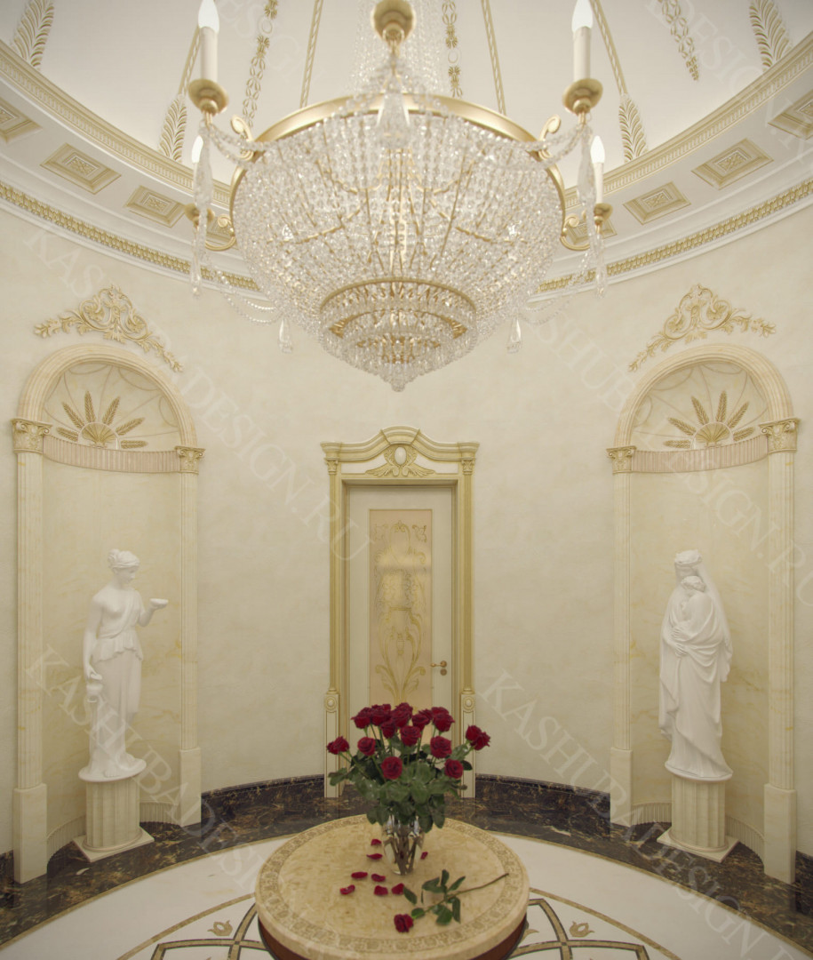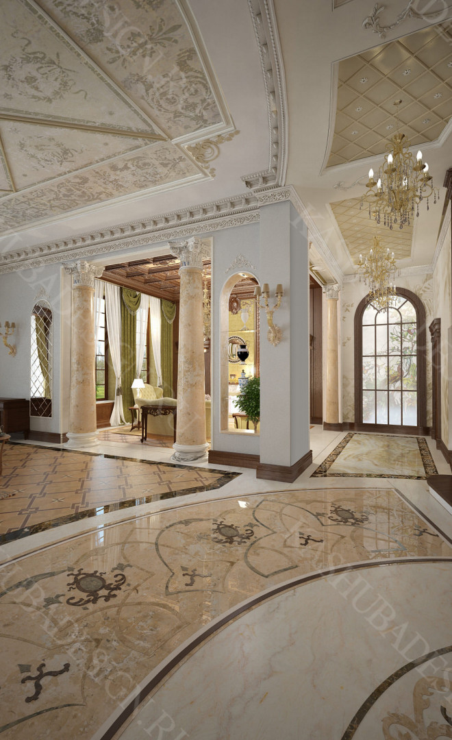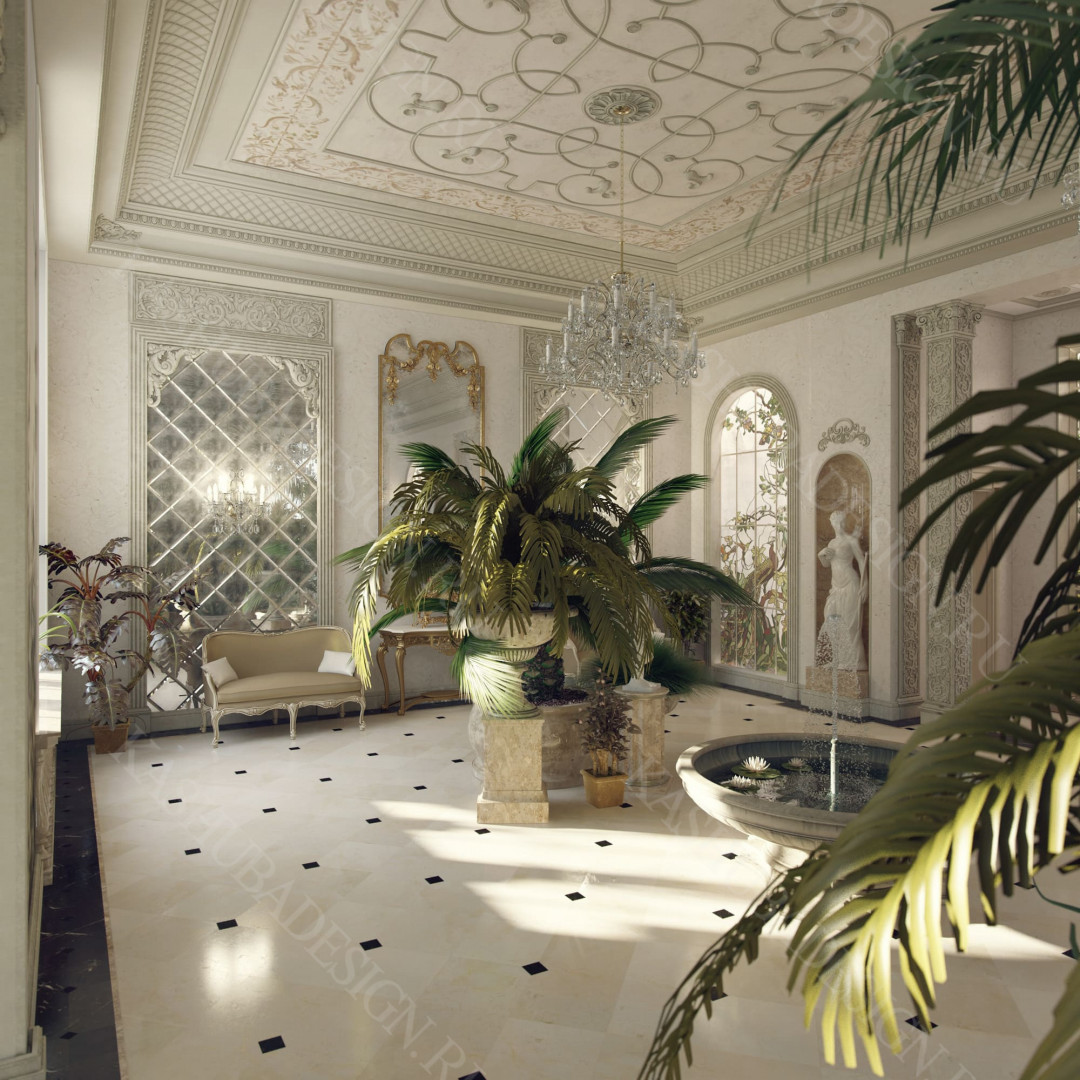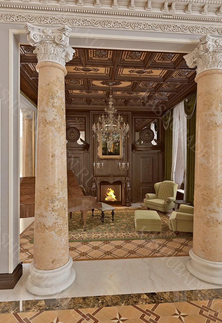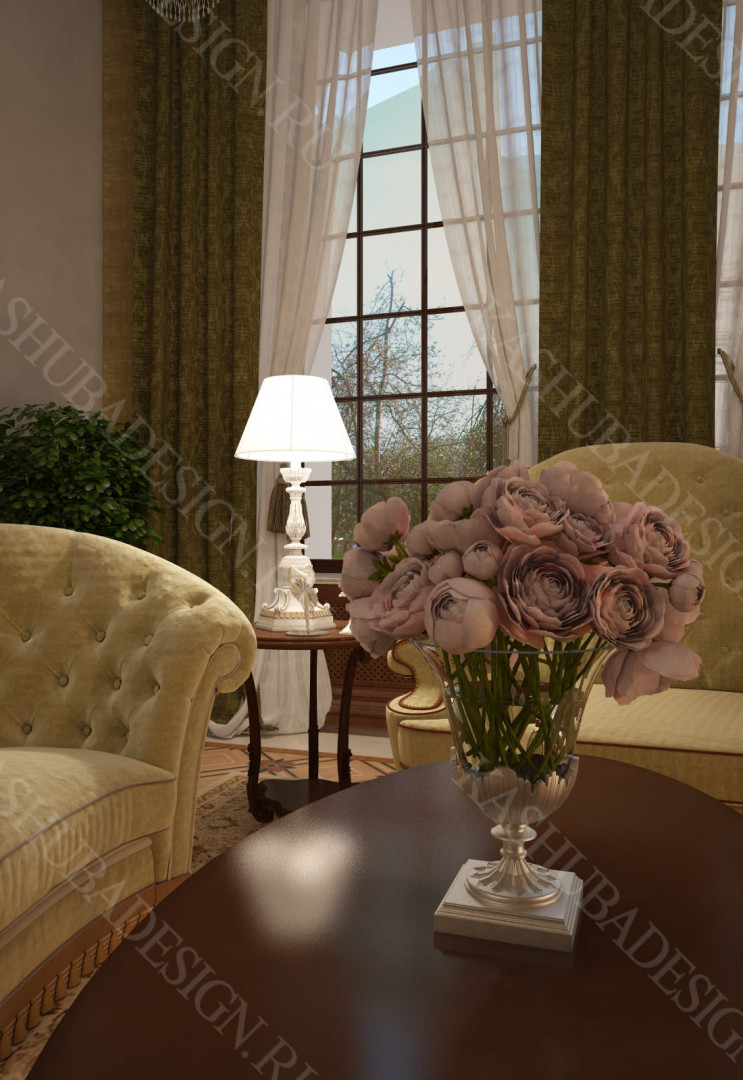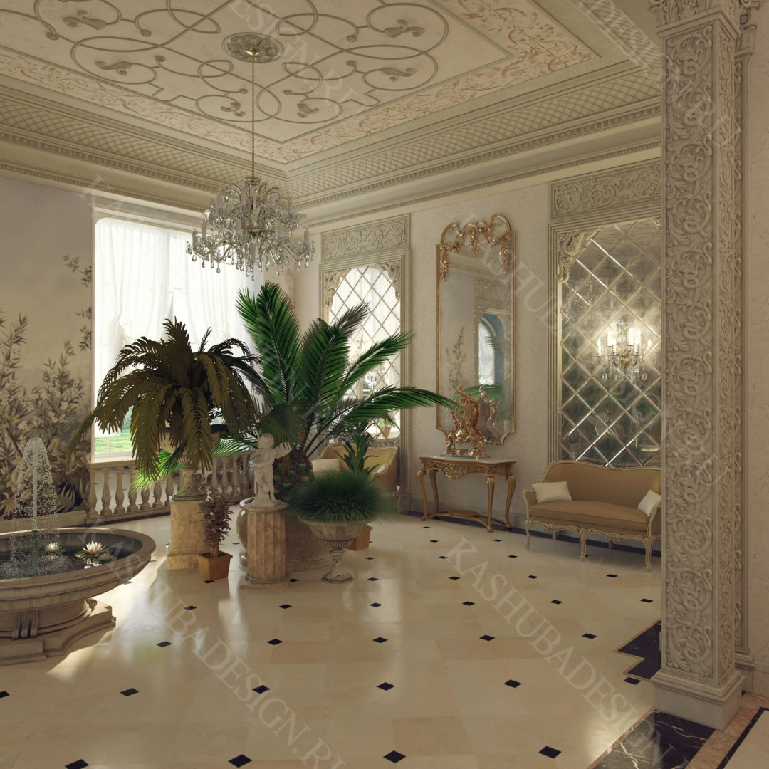 Для всех помещений усадьбы (высота потолков не менее 3-5 метров) характерна красота композиции, дозированное внедрение деталей и упорядоченность декоративного оформления, которые становятся выразительными тональными нюансами, растворяются в глубине пластичного объема, конструктивных решений. За их статичностью в пространстве, скрывается экспрессия прочтения. Очевидно, доминирует стиль - классика, что позволяет отнести роскошные интерьеры особняка к эклектичному дворцовому варианту. Здесь все на месте, все удалось и актуально, удивительно гармонично сочетание черт изящного аристократизма со сдержанным шиком всех входящих в интерьер элементов, предметов, мебели, посуды, осветительных приборов и пр. Если лучшие интерьеры и красивые интерьеры, то в них таится нечто большее, чем изысканность и роскошь.