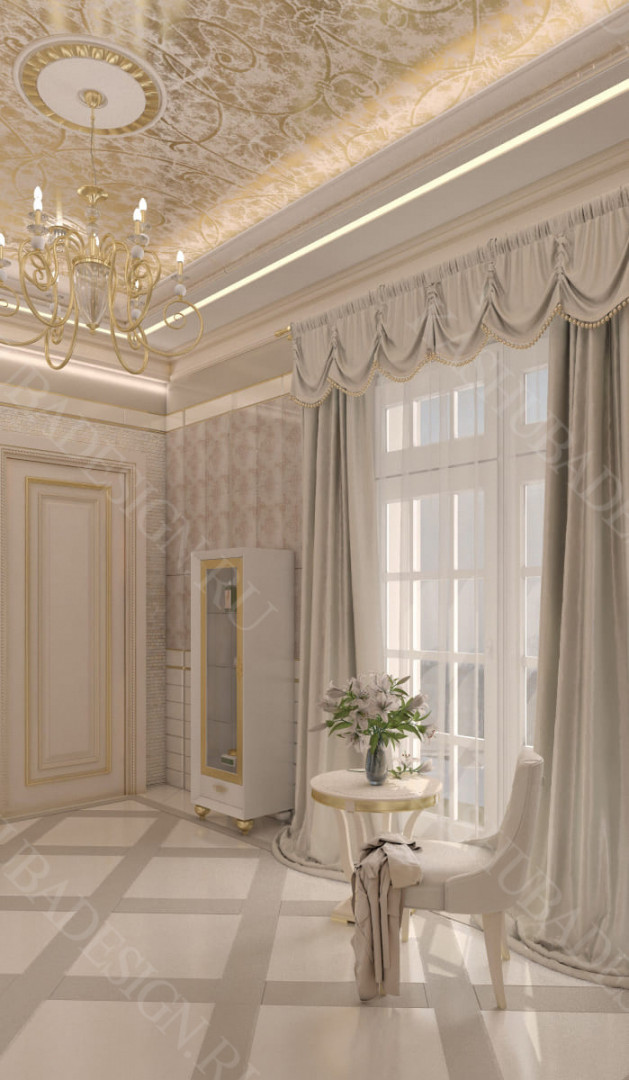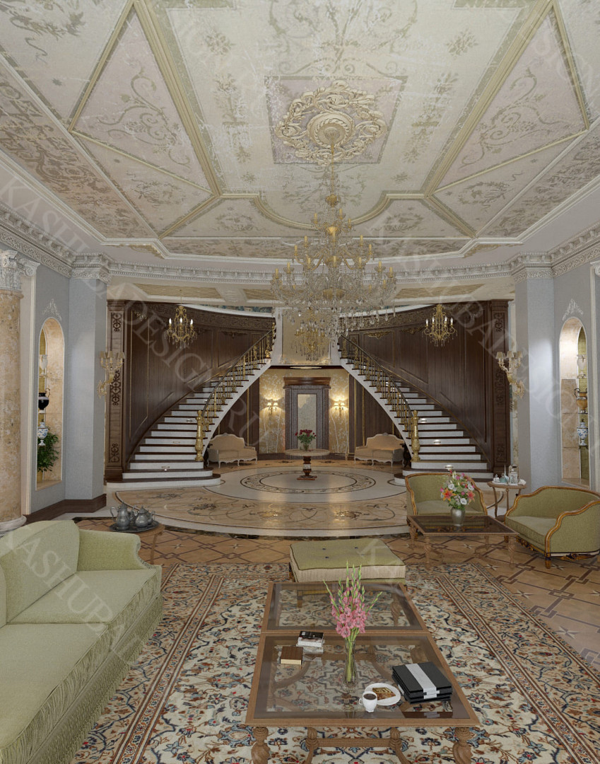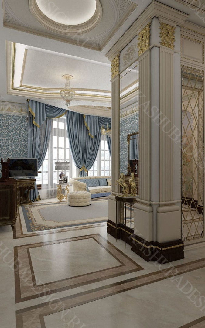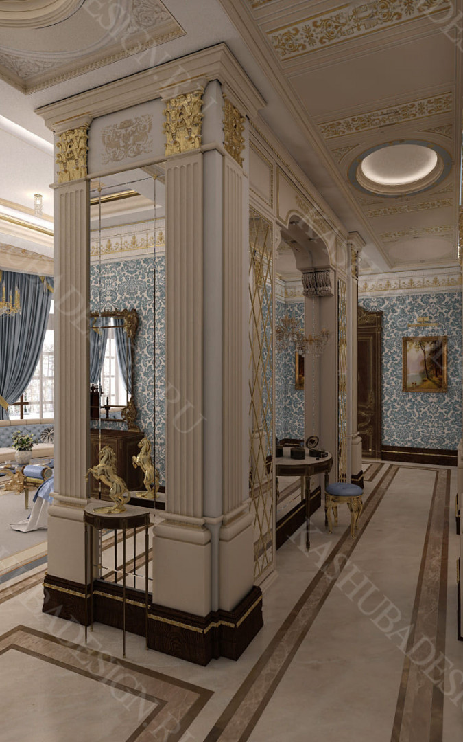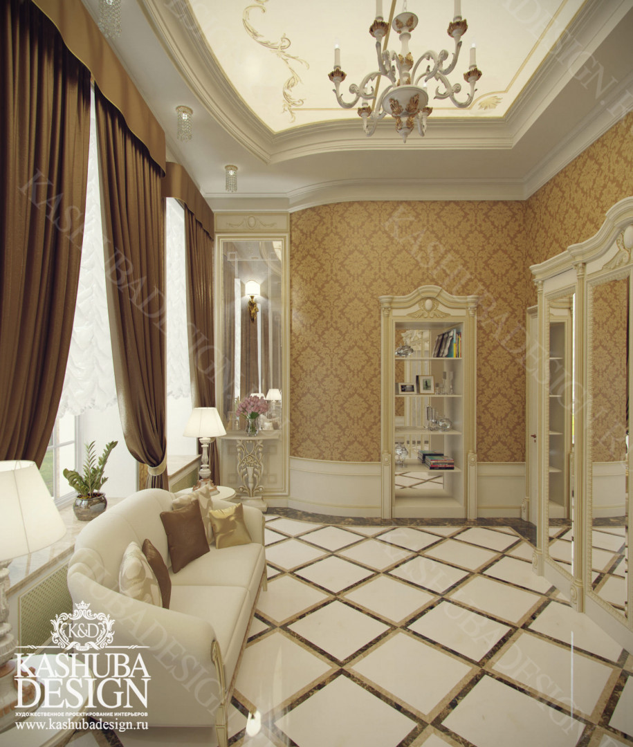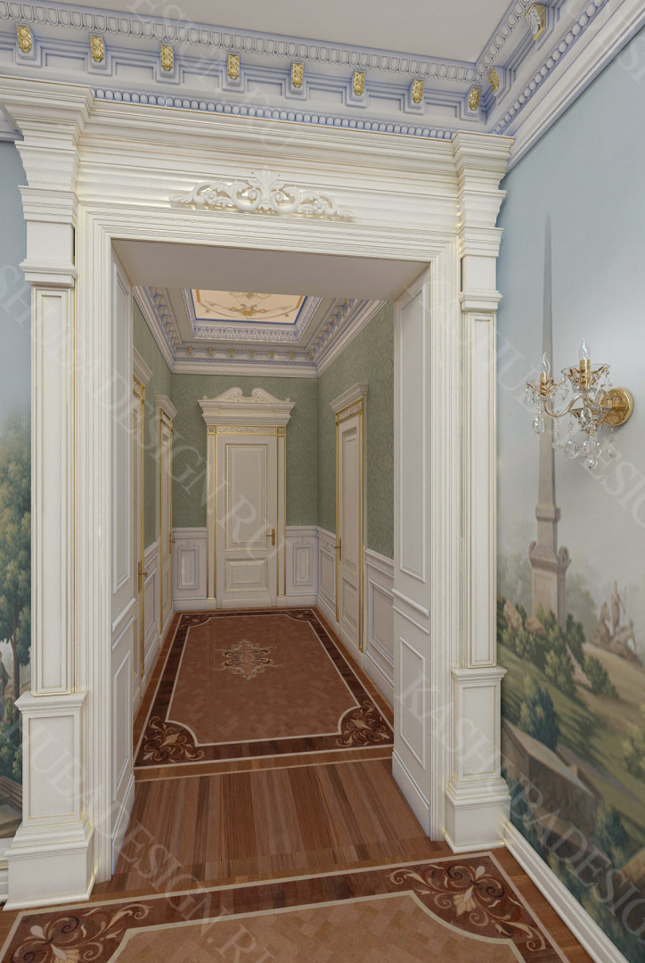 Для всех помещений усадьбы (высота потолков не менее 3-5 метров) характерна красота композиции, дозированное внедрение деталей и упорядоченность декоративного оформления, которые становятся выразительными тональными нюансами, растворяются в глубине пластичного объема, конструктивных решений. За их статичностью в пространстве, скрывается экспрессия прочтения. Очевидно, доминирует стиль - классика, что позволяет отнести роскошные интерьеры особняка к эклектичному дворцовому варианту. Здесь все на месте, все удалось и актуально, удивительно гармонично сочетание черт изящного аристократизма со сдержанным шиком всех входящих в интерьер элементов, предметов, мебели, посуды, осветительных приборов и пр. Если лучшие интерьеры и красивые интерьеры, то в них таится нечто большее, чем изысканность и роскошь.