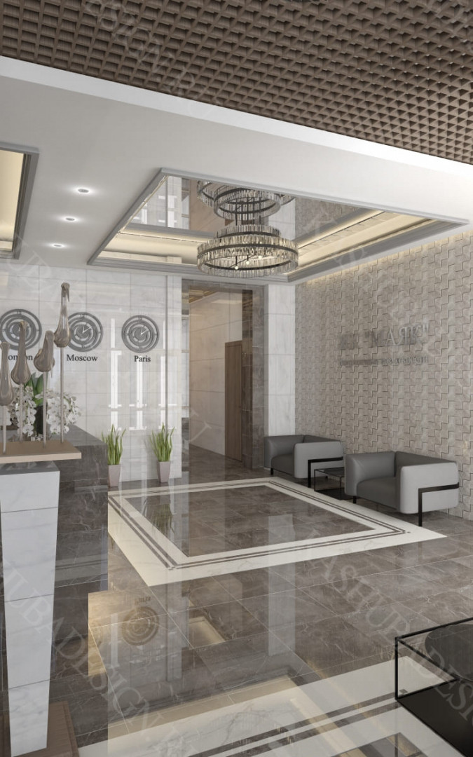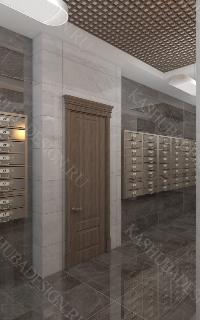 Входная зона одного из корпусов комплекса имеет общую площадь - 142.8 м.кв. Её планировка, в рамках реального и разумного, состоит из зон рецепшн и ожидания, имеет холл с ящиками для почты. Используемые отделочные материалы: керамогранит, гипсовая лепнина, зеркала с тонировкой и фасцетом, в зоне рецепшн - заказной шкаф в столярном исполнении. Композиционный ход дизайнера вписывает в пространство, соединяет в мягких контрастах передний и дальний план красивого и престижного интерьера, даже используя зеркальные отражения. Эта территория гостеприимства и безопасности, где авторское и зрительское восприятие комфорта сходятся вместе, обозначаясь выражением «прелесть что такое».